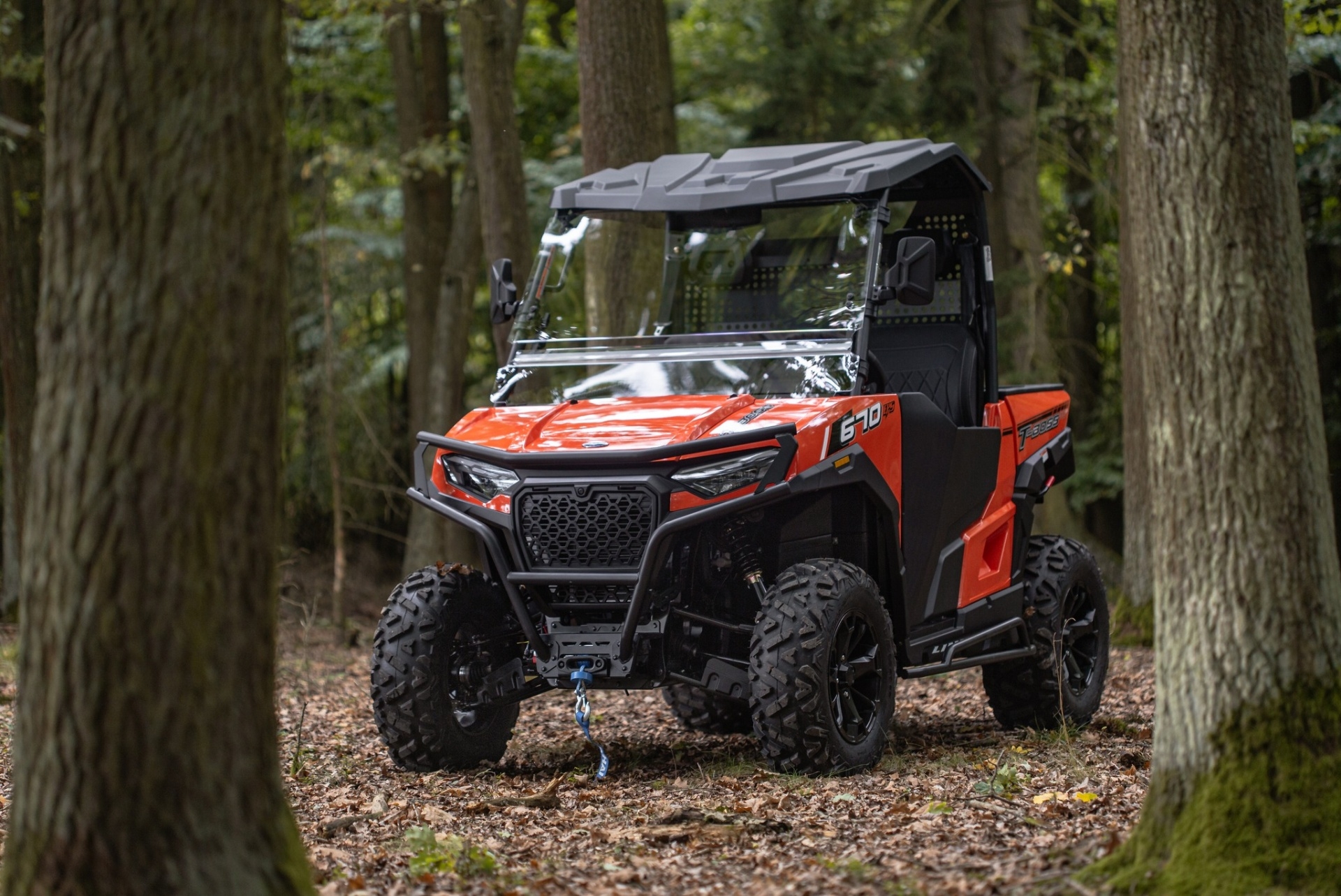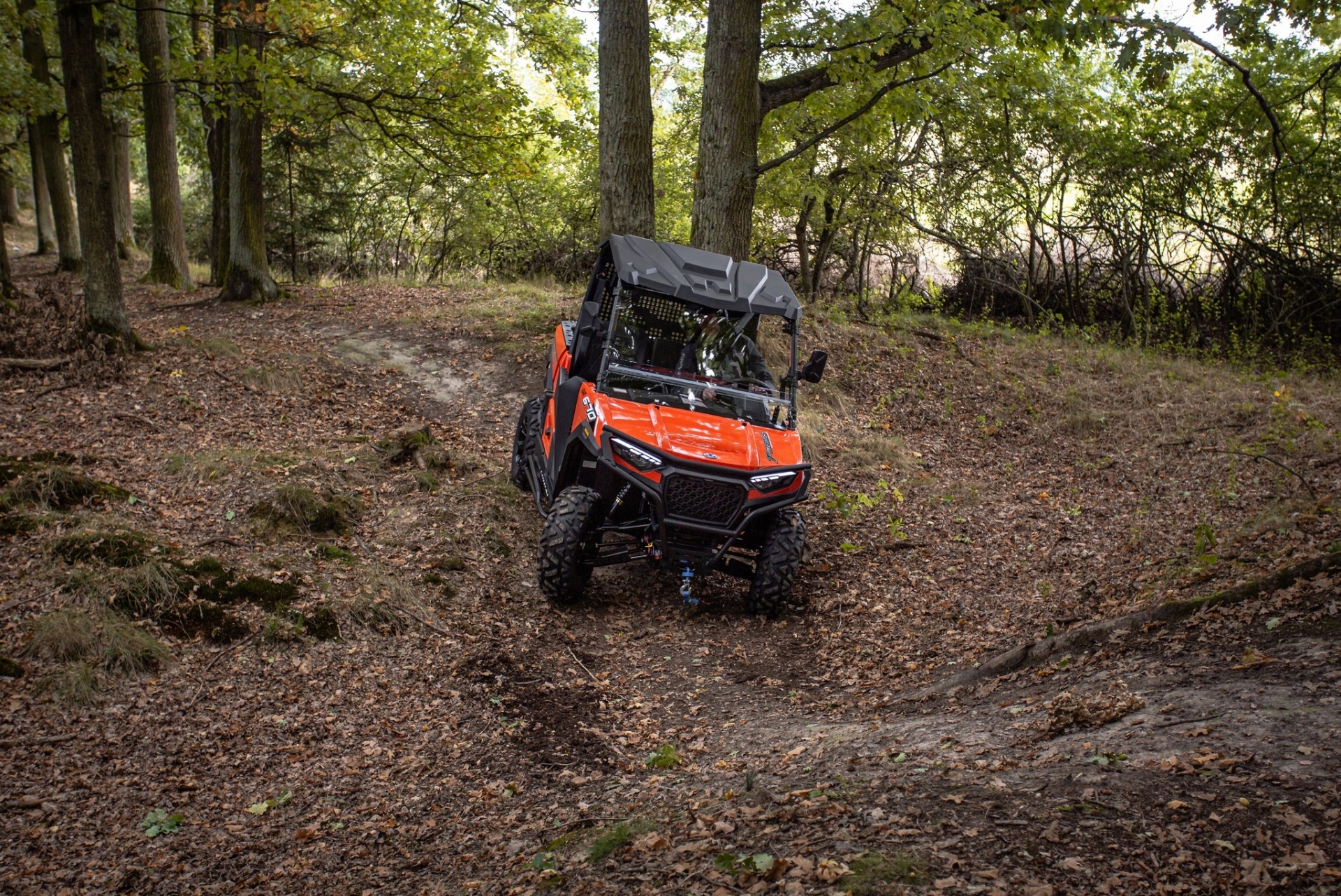| Elektrický posilovač řízení, poloviční plastové dveře, pevná plastová střecha, třímístné lavicové sedadlo s bezpečnostními pásy, výškově nastavitelný volant, plné čelní plexi, přední ochranný rám, madla pro spolujezdce, sklápěcí korba s plynovými vzpěrami, hlavové opěrky, 2 držáky nápojů ve středové konzoli, homologované tažné zařízení, elektrický naviják 3000lbs s dálkovým ovládáním (syntetické lano) |