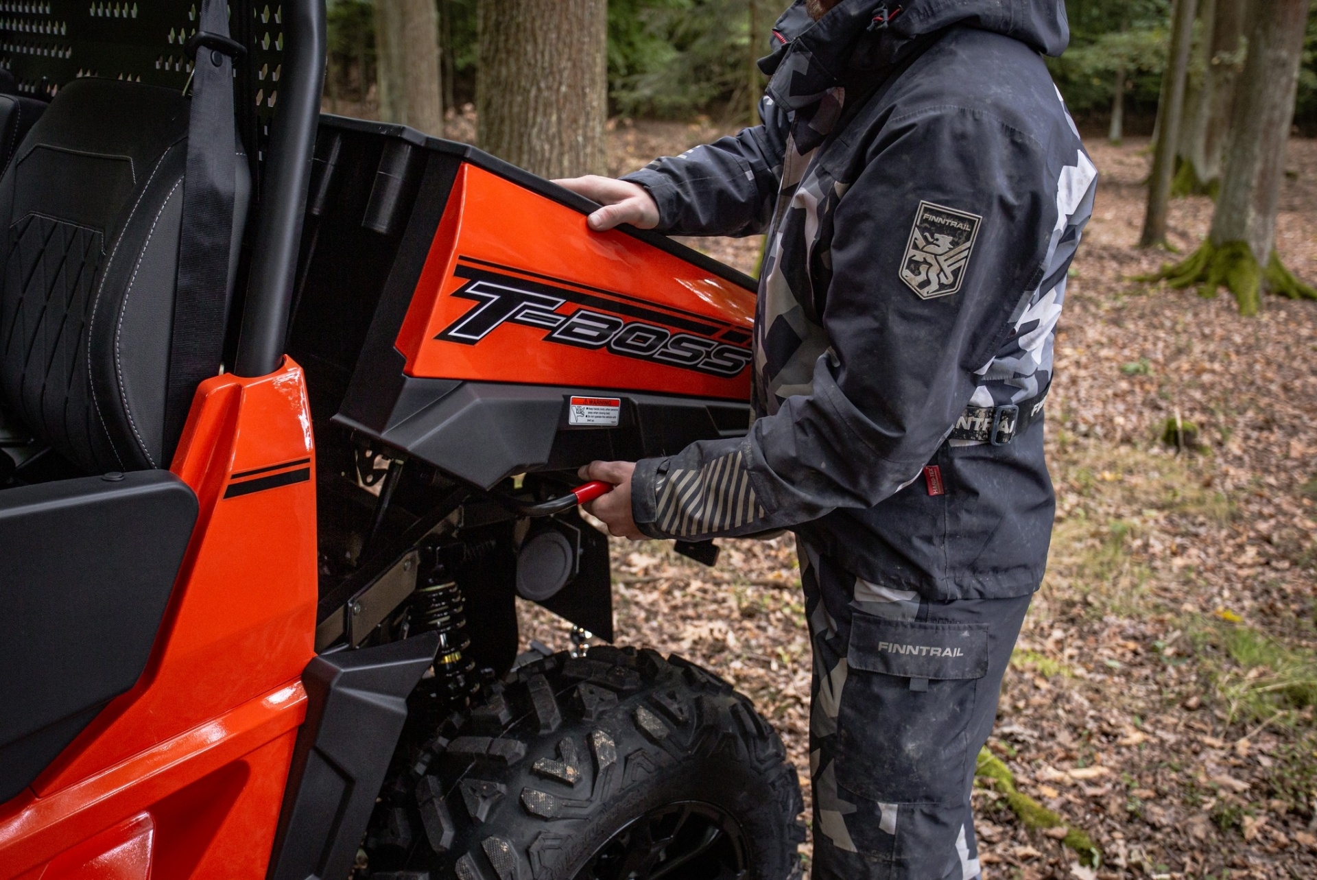T-Boss 670 je vybaven praktickými úložnými místy, která oceníte při každé jízdě. Pod sedadlem řidiče najdete objemnou schránku pro větší vybavení, před spolujezdcem klasickou přihrádku jako v autě a mezi sedadly sklopnou opěrku se dvěma držáky na láhve a malou přihrádkou na mobil nebo jiné drobnosti.Praktická zadní deska