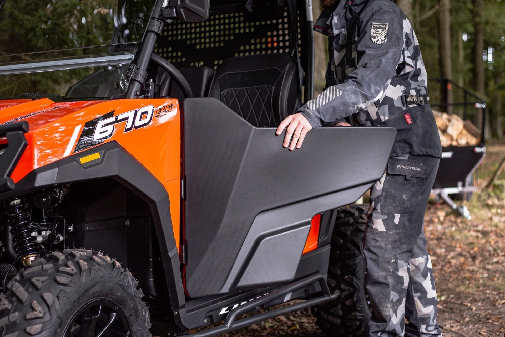 Boční plastové dveře chrání posádku před větrem, prachem a nečistotami. Jejich široké otevírání zajišťuje pohodlný přístup do kabiny a snadné nastupování.