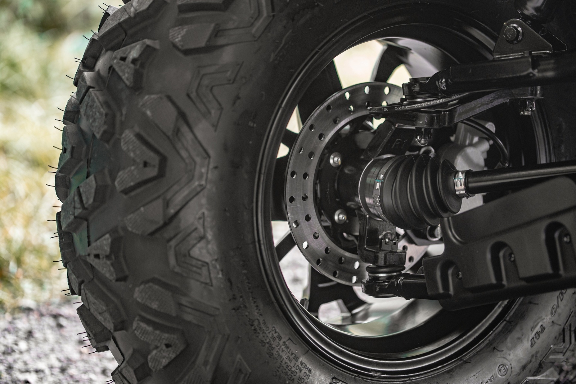 Černé 14" hliníkové disky dodávají stroji moderní vzhled a zároveň přispívají k odolnosti i chlazení brzd. Robustní konstrukce kol zajišťuje stabilitu při jízdě s nákladem i v náročném terénu.Snadná údržba